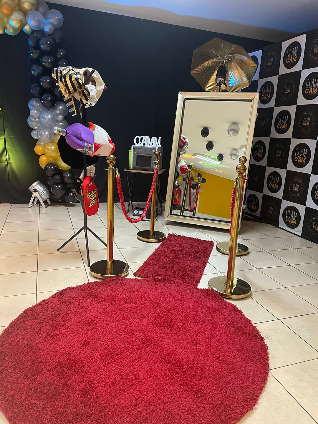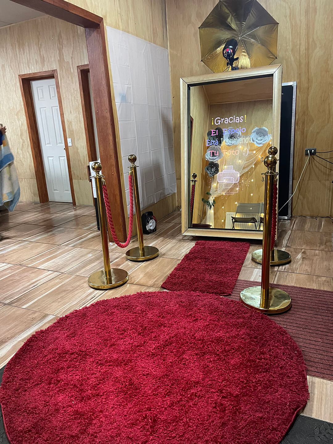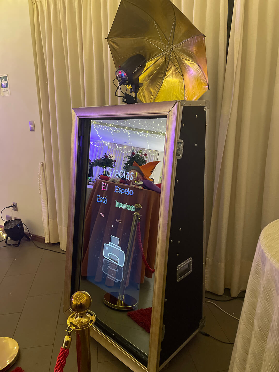 Espejo fotográfico interactivo con pantalla táctil y fotos impresas al instante.